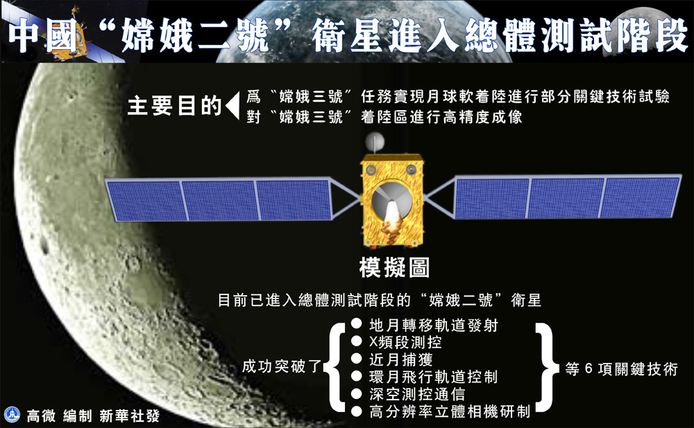 圖:嫦娥系列衛星總設計師葉培建早前曾談到中國未來的探月計劃,他表示,在嫦娥三號之後,中國還會有嫦娥五號、嫦娥六號衛星,發射後將進行返回。圖示嫦娥二號目的為對嫦娥三號實現月球軟着陸進行關鍵技術試驗新華社