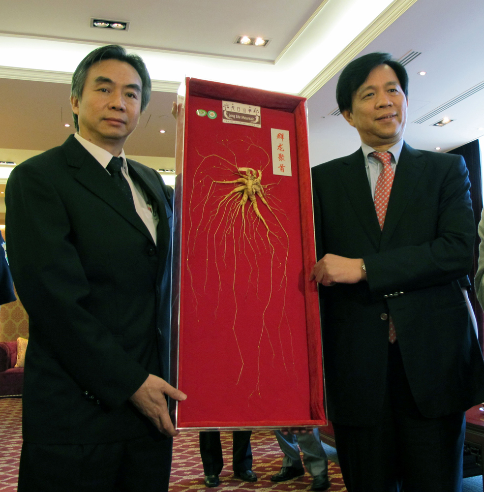 圖:吉林省副省長陳偉根(右)和台灣長白山參茸公司負責人丁章璽展示人參王\中央社