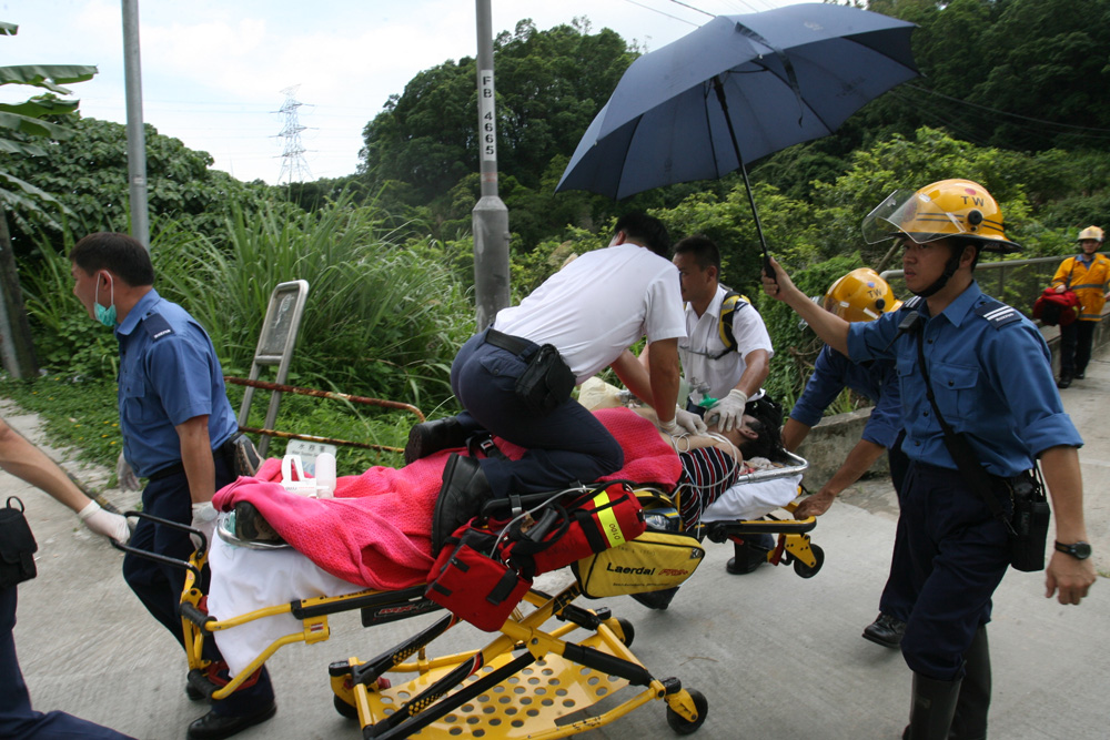消防員趕至搜索,疑因報警人士沒有清楚指出事發位置,消防員在荃錦公路步行十分鐘至大橋村村口,再沿引水道前行約二百米後,始找到事主正確位置,由於事主情況危急,馬上進行急救,跟着用擔架床送事主落山,期間一名救護員跨上事主身上不停做心外壓,再由消防員在旁打傘,惜送抵仁濟醫院搶救後證實不治。妻及兒子事後趕到醫院,知道噩耗傷心不已。