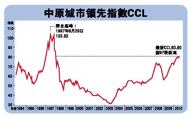 「九招十二式」推出以來,樓市升勢更瘋狂。反映樓價走勢的中原城市領先指數CCL最新報80.90點,按周升0.93%,締97年尾的85.85點紀錄之後的12年半新高,惟與97年CCL歷史高峰的103.82點尚有25%距離。