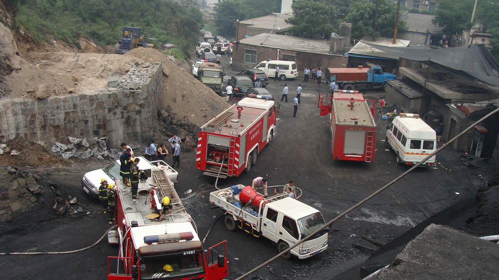 在該礦煤場停放着三輛消防車、救護車和一些救援物資車輛。消防車周圍和車頂,全副武裝的消防官兵正通過水管向井裡注水,車頂的消防隊員不斷向水裡添加紅色泡沫劑,井口西面一部分已經壘起沙袋。