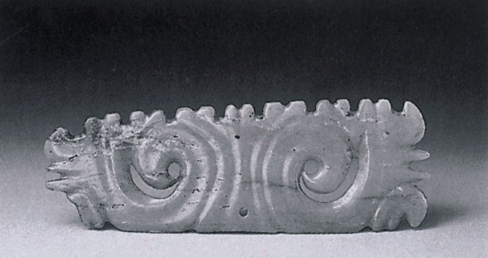 例如附圖的蜷曲雙鳥紋玉件,上方、左方、右方均磨有凹槽如參差不齊的小齒,底打小孔,就是紅山文化典型的傑作(現珍藏於天津博物館);乃用「壓地隱起」凸顯曲線。雙鳥造型原始古拙,近於半抽象,紅山文化很少用線雕,表面邊緣大多數磨薄,看起來甚有藝術感,那是其特徵之一。
