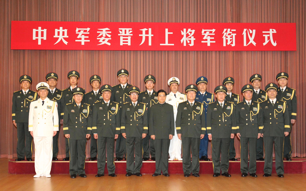 中央軍委19日下午在北京八一大樓隆重舉行晉升上將軍銜儀式,中央軍委主席胡錦濤頒發命令狀。中央軍委副主席郭伯雄宣讀了7月5日胡錦濤簽署的晉升命令,中央軍委副主席徐才厚主持,中央軍委委員梁光烈、陳炳德、李繼耐、廖錫龍、常萬全、吳勝利出席。