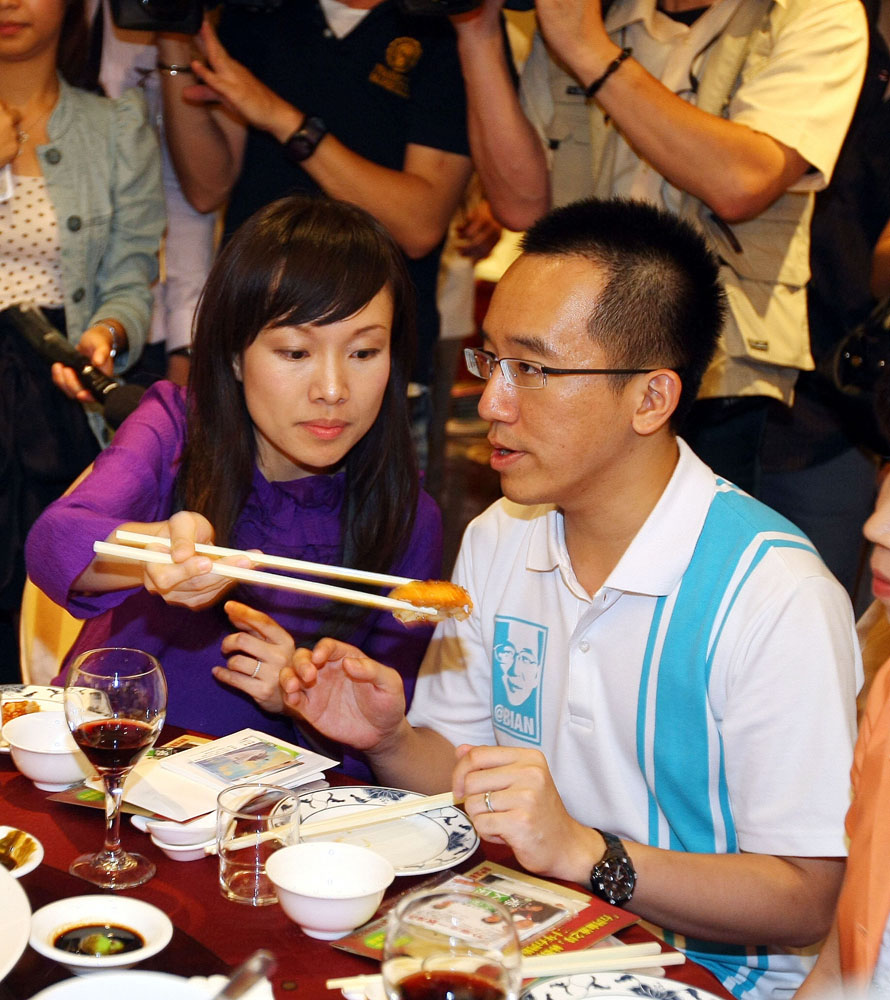 圖:陳致中夫婦23日晚間出席台灣北社九周年募款餐會時,表現恩愛\中央社