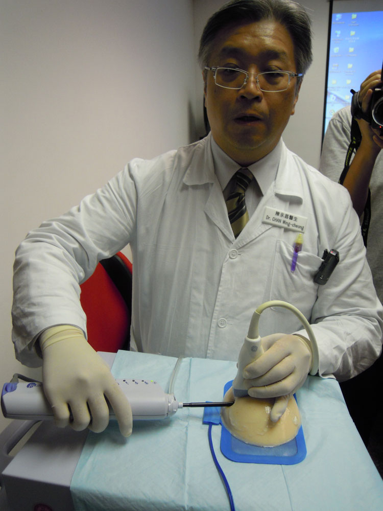 北區醫院外科部顧問醫生陳永昌接受訪問時說,曾有一位四十五歲已婚女病人,因其姊姊患過乳腺癌,十分擔心自己也得病,便定期接受乳房X光造影檢查。該女士早前發現左乳房有一小塊陰影,經多次傳統抽針檢查,均不能確定,心情焦慮。她後來選擇「鉗公仔」手術,將一個一點二公分腫塊整個取出,經化驗百分之百證實屬於良性。