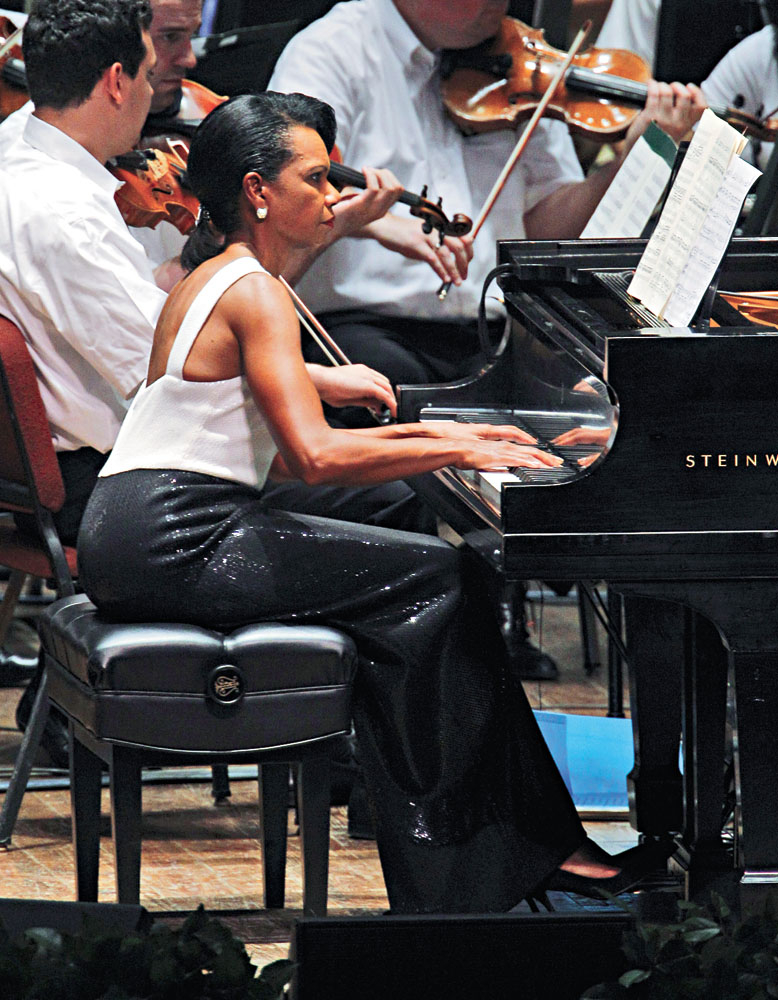 圖:美國前國務卿賴斯27日在音樂會上演奏莫扎特鋼琴協奏曲