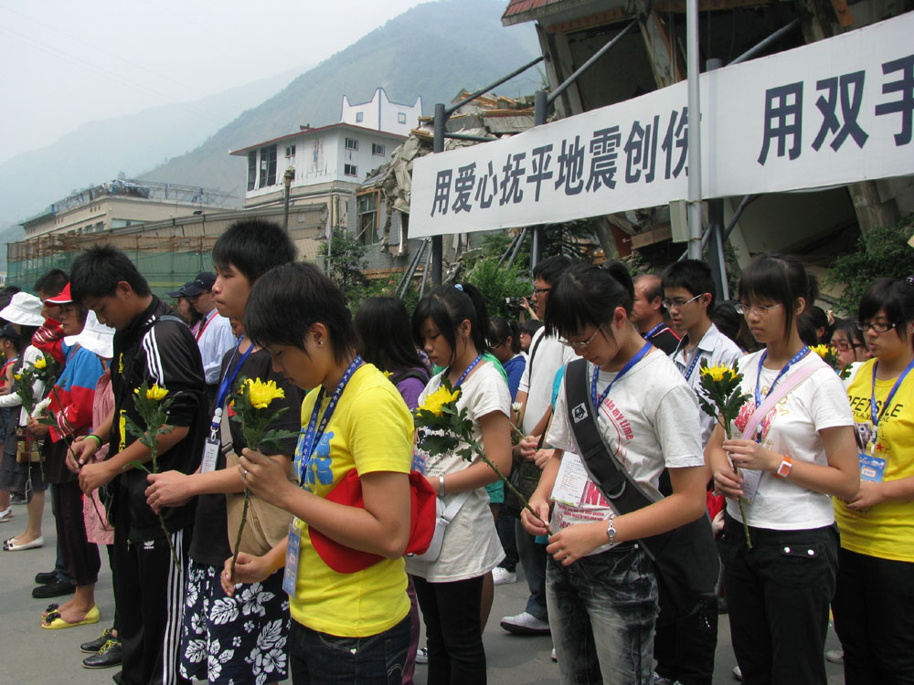 車輛緩緩駛入北川老縣城地震遺址,滿目瘡痍的廢墟、支離破碎的建築、震損變形的操場上高高聳立的國旗杆,都讓大家不約而同地變得沉默起來。師生們每人手捧一支黃色或白色的菊花,莊重地列隊在「5·12」地震紀念碑前。令人心傷的音樂漸漸響起,師生們向地震死難同胞默哀並三鞠躬,隨後依次將手中的鮮花獻在紀念碑前,整個過程簡短而肅穆。