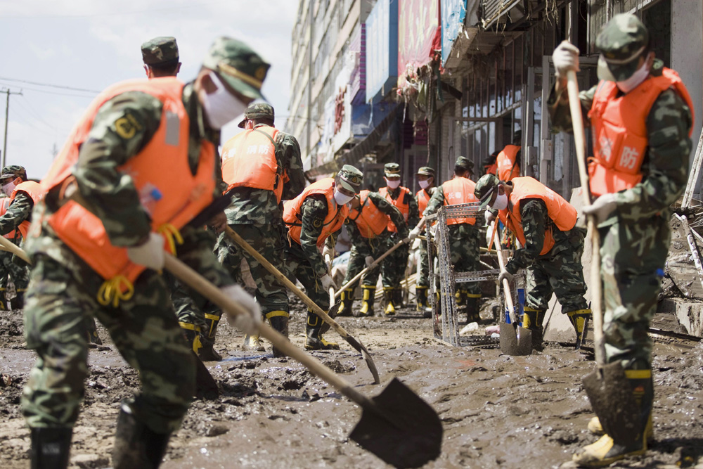 圖:洪水過後一片狼藉,支援地方抗洪的軍人在吉林永吉縣城清理淤泥\法新社