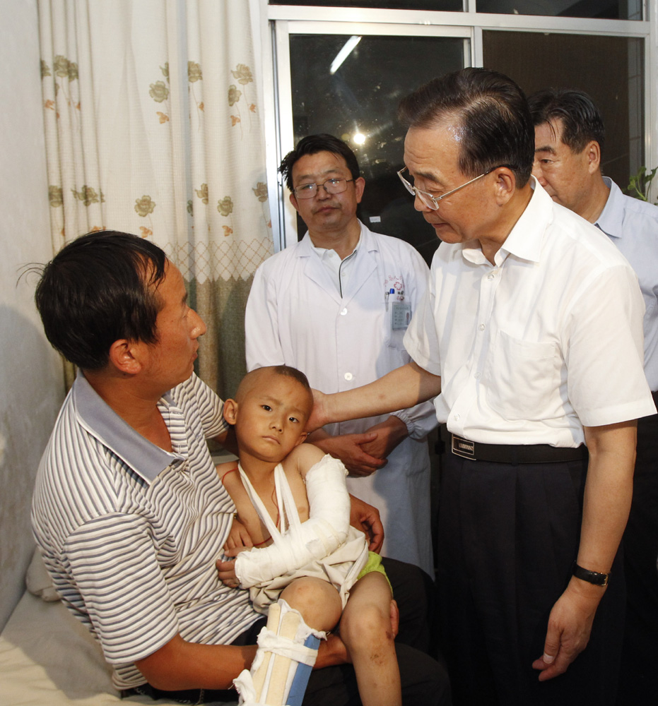 圖:中共中央政治局常委、國務院總理溫家寶在舟曲縣醫院看望傷員\新華社