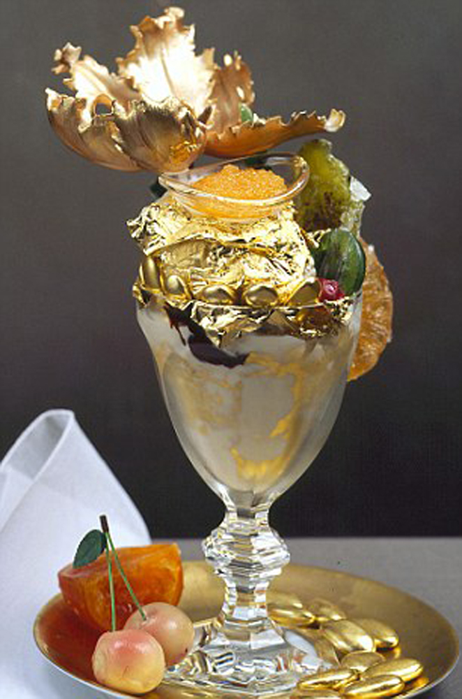 每一份天價甜品都保持着該餐廳一貫的追求:用心製作世界聞名以及價格昂貴的美食,其中包含24卡可食用的瑞士黃金,周圍由23卡同樣可食用的金葉圍成一圈,看起來富麗堂皇。
