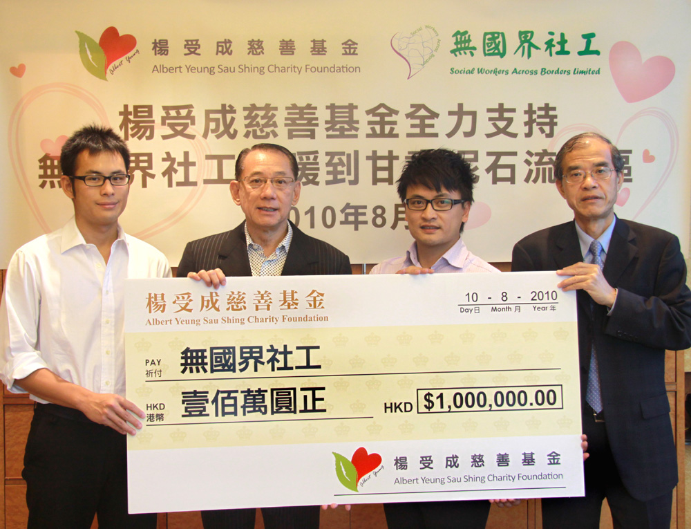 楊受成昨日以「楊受成慈善基金」名義,捐出一百萬港元予無國界社工。無國界社工將派出五名義工於本周五或以前到災區視察災情,並安排該一百萬元善款購買災民目前最需要的物資,例如一般生活必需品等。首批物資最快可於本月二十日送到災民手中。