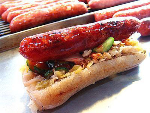 大腸包小腸是台灣相當普遍的小吃,炭火燒烤的大腸外皮微酥,內餡米粒飽滿,夾上風味絕佳的香腸,鋪上酸菜、小黃瓜、薑片與菜脯蛋等小菜,一口咬下肉汁四溢,滿嘴的美味。