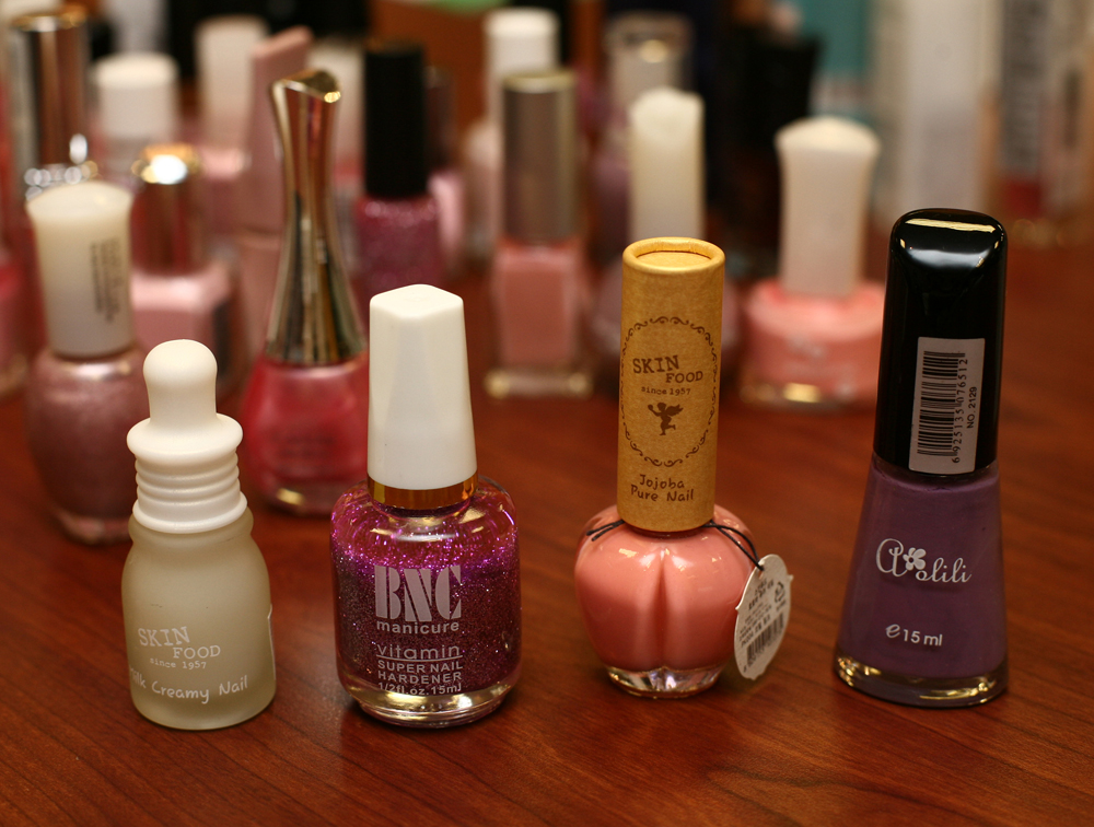 圖:四款指甲油(圖上前排三款及圖右的一款)被發現含有致癌物苯 本報攝