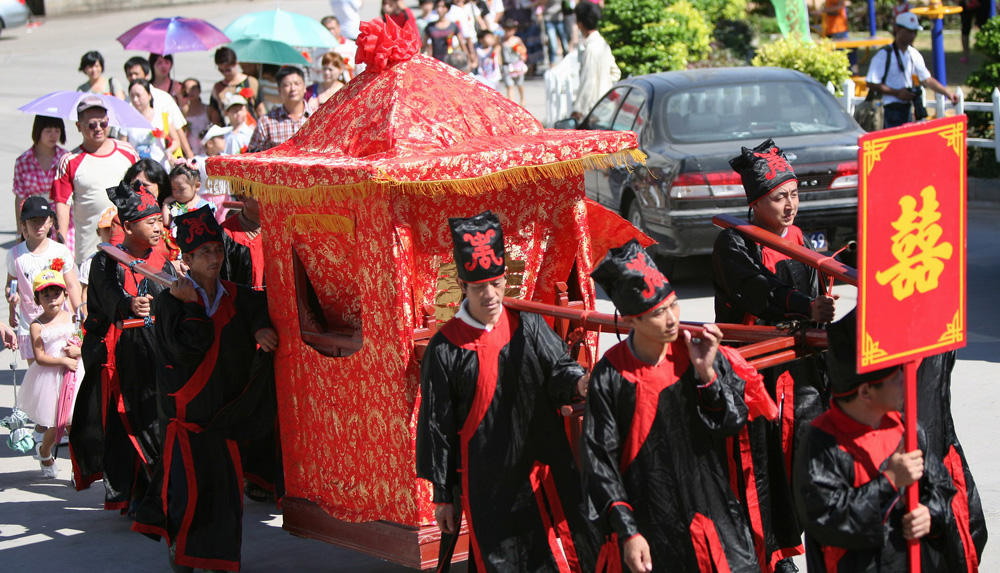 今天是中國傳統的七夕「情人節」。在金井鎮圍頭村永平中心廣場,圍頭村的父老鄉親熱情歡迎從台灣本島、金門、澎湖回到圍頭村省親的圍頭新娘和姻親外眷。村頭的雄闕殿裡,還舉行了祭拜儀式,祈求好運,仿古婚禮重現了新娘乘坐八抬大轎、新郎騎馬迎親的場面。