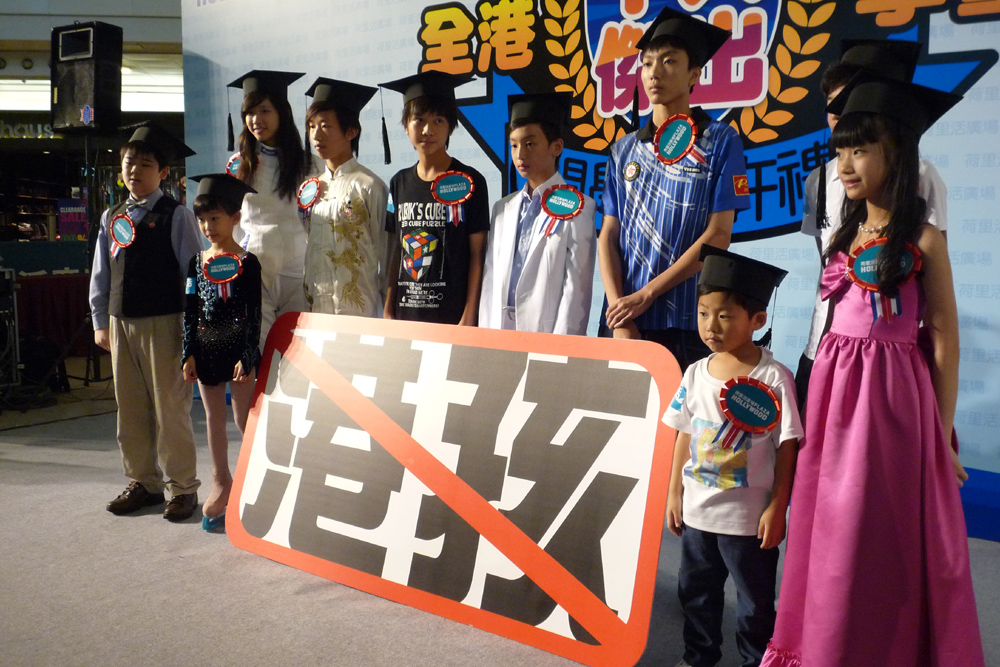 圖:十名在藝術、音樂及運動等方面表現出色的學童,昨宣傳不做「港孩」訊息 本報攝