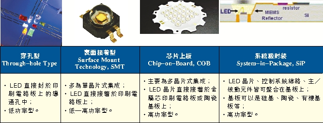 電子封裝技術發展至今,根據不同的應用場合、外形尺寸、散熱方案和發光效果,衍伸出各式各樣的LED封裝形式,按LED與基板的內連結(interconnection)方式和次連接基板(sub-mount substrate)的不同,大概分為穿孔型(或稱砲彈型)、表面接着型與芯片上板型三種;為因應更輕、薄、短、小的LED產品需求,應科院又提出了LED系統級封裝(LED-SiP)平台技術構想和方案,獨樹一幟。表一把四種技術作出比較。