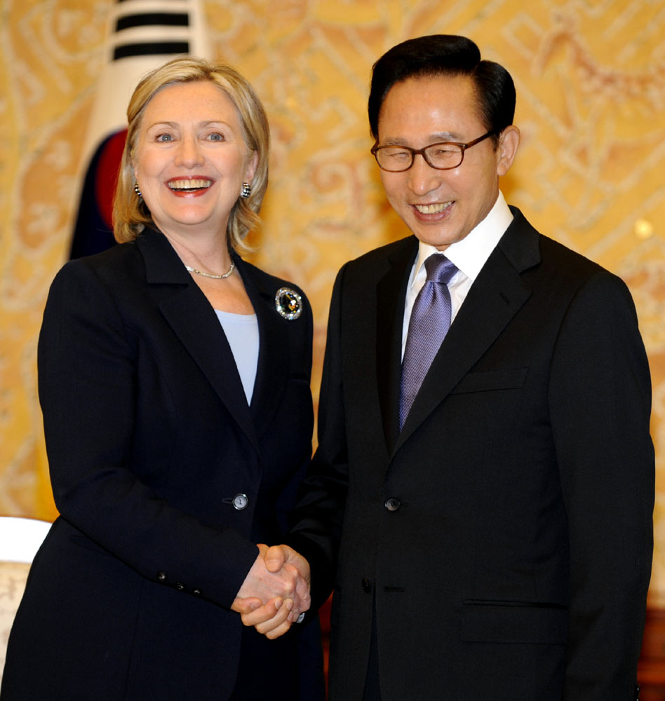 圖:韓國總統李明博(右)表示積極評價朝鮮最高領導人金正日訪華。圖為李明博會晤美國國務卿希拉里資料圖片