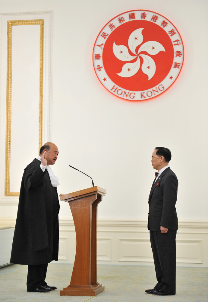 圖:馬道立(左)在曾蔭權(右)的監誓下,作出司法誓言