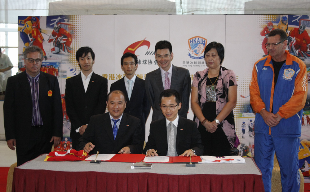 圖:香港冰球訓練學校主席胡文新(前排右)與中國冰球協會秘書長于天德(前排左)簽署贊助合約,後排右二為中聯辦宣傳文體部副部長陳亞瓊