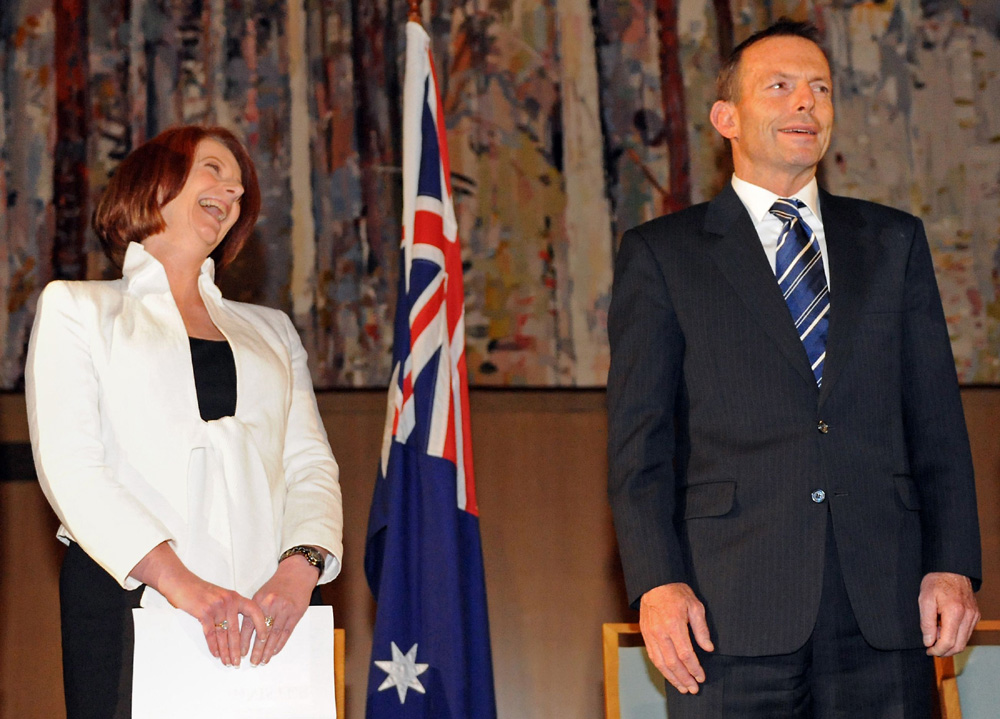 圖:大局已定,澳洲現任總理吉拉德(左)與反對派領袖阿博特都展露笑容\法新社
