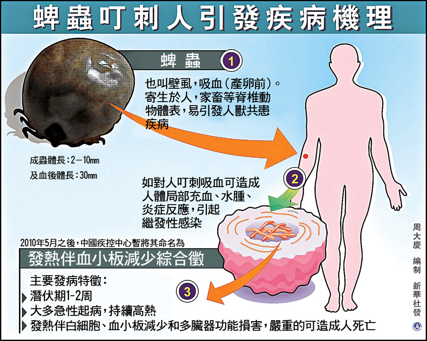 【本報記者高毅鄭州九日電】河南、山東等多省出現蜱蟲叮咬致人染病事件,目前至少29人死亡。其中河南累計557人發病,18人身亡;山東蓬萊有11人染病死。湖北荊州地區也有疑似病例發生。