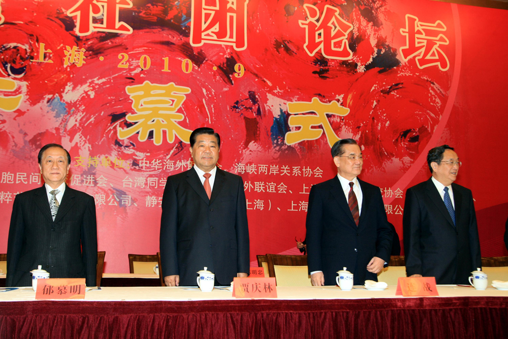 圖:全國政協主席賈慶林(左二)、上海市委書記俞正聲(右一)、中國國民黨榮譽主席連戰(右二)、新黨主席郁慕明(左一)昨日在上海出席台胞社團論壇開幕式\中新社