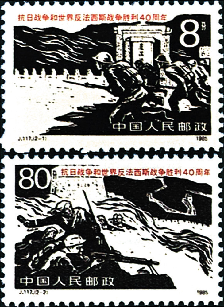 1985年9月3日,中國郵電部發行了一套兩枚的「抗日戰爭和世界反法西斯戰爭勝利40周年」郵票,編號J.117。