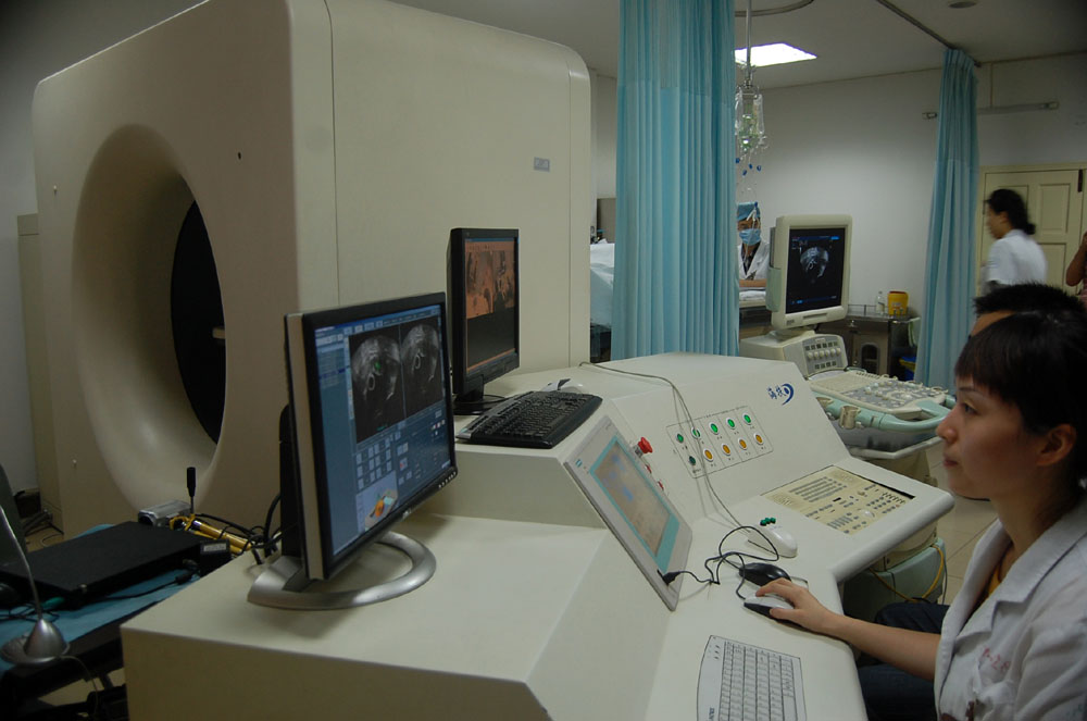 圖:重醫附一院超聲消融中心手術室,醫生正在為病人進行「無創」切除腫瘤手術\韓毅攝