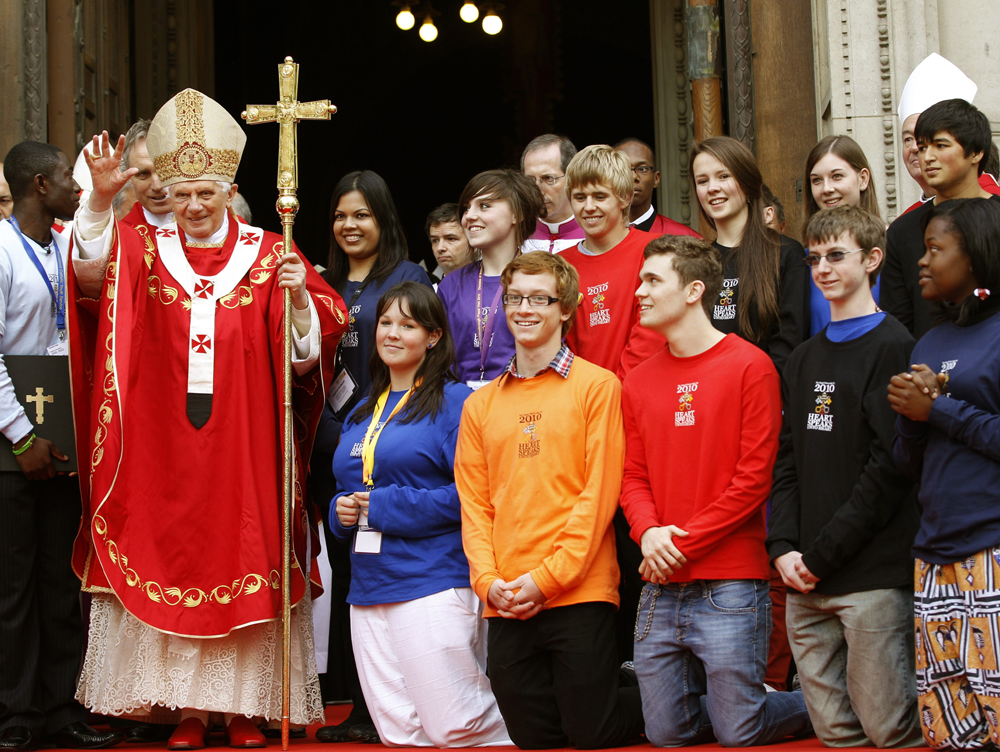 圖:教皇本篤十六世18日在倫敦西敏寺大教堂與一群信奉天主教的青年合影 路透社