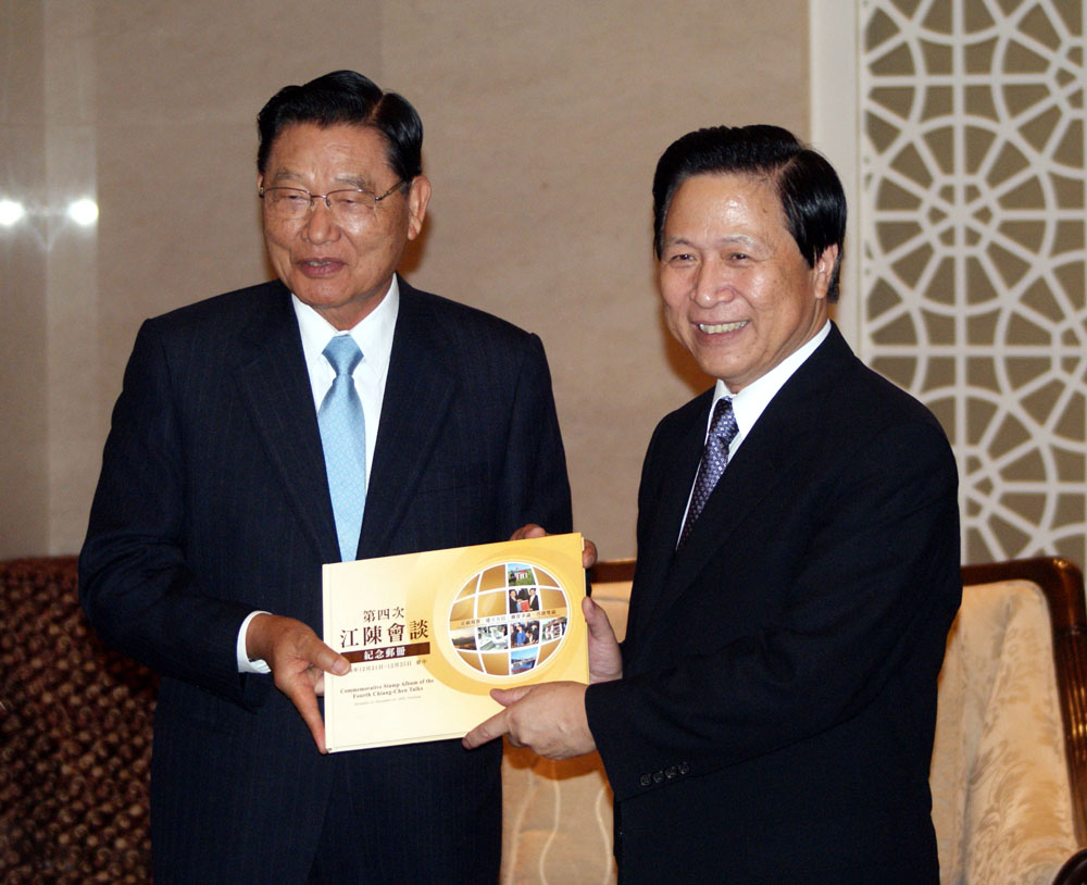 圖:海基會董事長江丙坤(左)19日贈第四次「陳江會」紀念郵冊給江蘇省委書記梁保華(右)中央社