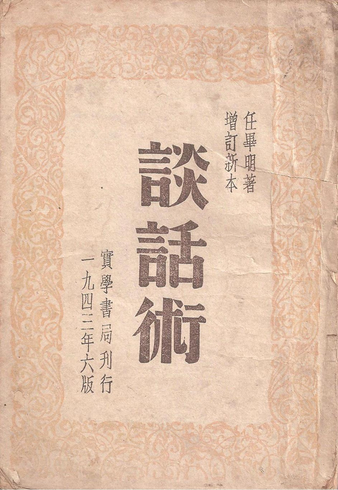 一九七○年代,我開始用心訪尋民國版舊書,視野擴大,才知道任畢明一九二五年已在廣西梧州創辦《民國日報》,後應邀來港辦《大眾日報》……早在三十年代已成名,著作亦不單只有上述兩本,還有《社會大學》、《新社會大學》、《龍虎集》、《戰時新聞學》和《評論學十講》……等。如今大家見到的這本《談話術》,是一九四三年桂林實學書店出版的,封面上註明是「一九四三年六版」增訂的新本,在烽火歲月的火紅年代,生活困苦的知識分子們,竟肯付錢買這本土紙《談話術》,使書能銷到六版,實在不簡單。一個人能辦報、寫社論、雜文,冷靜地分析歷史事件,對社會有深入的認識,任畢明是個「周身刀、把把利」的奇才雜家!