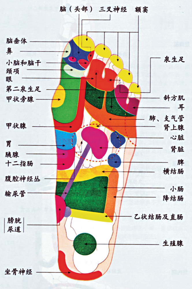 腳底部存在着各臟器的反射區,某些臟器發生病變後,可以在其反射區上反應出來。按摩和刺激相應的反射區,可以促進局部血液循環,從而達到治病強身目的。