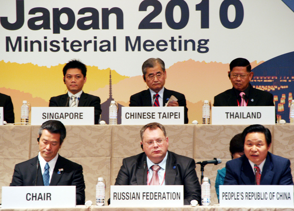 圖:在日本召開的APEC觀光部長會議中,中國代表(前右)指中日間存在影響觀光的嚴重問題,責在日方 中央社