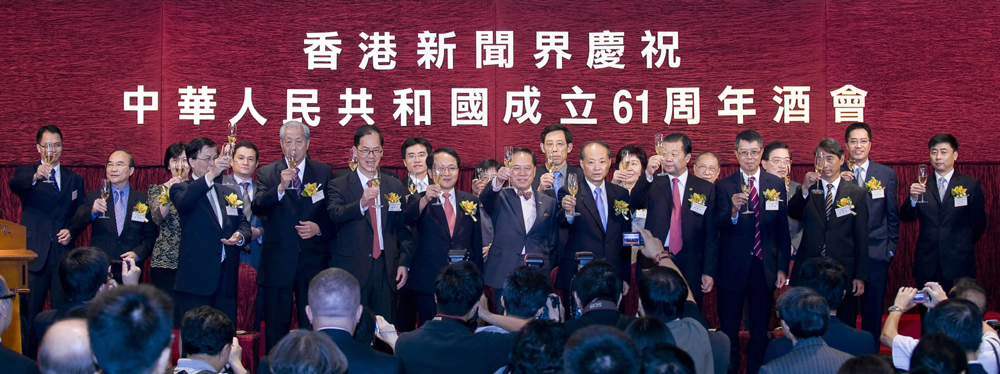 為慶祝中華人民共和國成立六十一周年,香港新聞界昨日在金鐘萬豪酒店舉行國慶酒會,逾三百位新聞界代表出席,祝願祖國繼續騰飛、香港繁榮安定。行政長官曾蔭權、中聯辦副主任王志民以及外交部駐港副特派員詹永新等作為主禮嘉賓出席酒會。