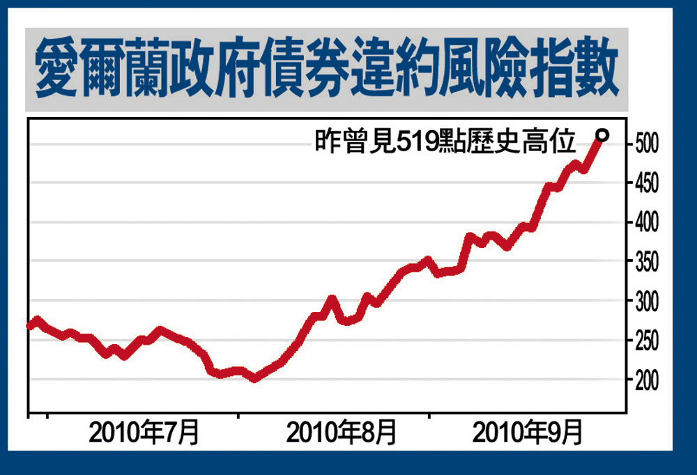 反映愛爾蘭政府債券違約風險的CDS,在昨日一度急升30個點子,至519點的新紀錄,而該國的CDS在過去兩個月以來已大升了超過一倍,至於反映整體西歐政府債券違約情況的CDS,亦上升了3.5個點子,至163.5。