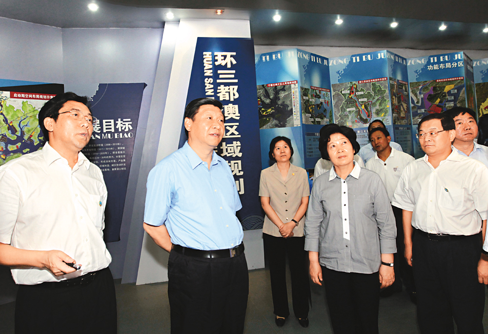 圖:國家副主席習近平(左二)本月上旬在福建寧德市考察時,仔細了解環三都澳建設規劃。他同時勉勵寧德核電站建設者發揮自己的聰明才智,把核電項目建設好,向國家和福建人民交上一份滿意的答卷。圖中前排右二為福建省委書記孫春蘭,左一為寧德市委書記陳榮凱,右一為寧德市代市長廖小軍\鄭傑攝