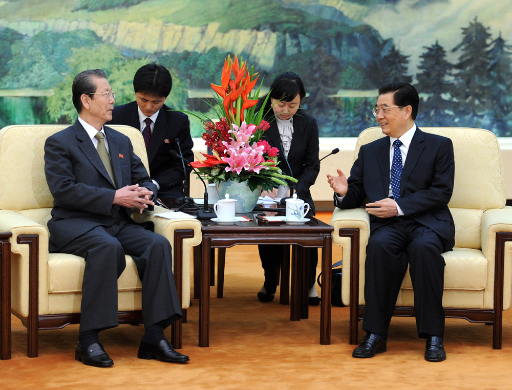 圖:二日,中共中央總書記、國家主席胡錦濤在北京會見朝鮮勞動黨中央政治局委員、書記局書記崔泰福率領的朝鮮勞動黨高級代表團 新華社