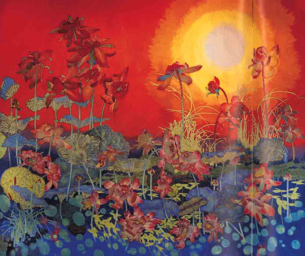這不是一幅一般意義上的國畫,簡直就是一幅壁畫。高五米,寬六米,比兩層樓還要高,他整整畫了四十天,每天十多個小時。此時,他不像老年人,更像個青年。整幅畫沒有草圖,黃老真正做到了「胸有成荷」。每一點一劃,看似隨意揮灑點染,實則恰到好處。看黃老作畫是一種享受。畫筆、墨彩,在他手裡宛如繡花針,穿針引線之間,蓮葉或舒或捲,菡萏或綻或斂,伸展自由,栩栩如生。宏大處,太陽當空,光芒四射,熾烈活躍,令人不敢逼視;細微處,荷葉上滾動的露珠,晶瑩剔透,彷彿要流出畫面。