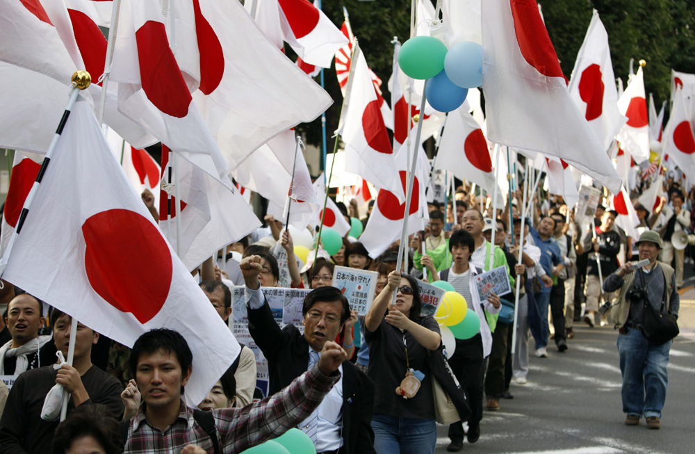 周六,在東京舉行的示威約有1500人參加,他們高舉日本國旗和軍旗,沿途高叫口號,指釣魚島是日本領土。前日本航空自衛隊幕僚長田母神俊雄、日本創新黨黨魁山田宏以及不少地方議會議員均參與示威遊行並發表演講。他們批評首相菅直人的內閣,尤其認為官房長官仙谷由人主導對中國的軟弱外交,呼籲日本國民再不動員起來保護國土,釣魚島將被中國「掠奪」,北方四島將永遠被俄羅斯「霸佔」等。當天,除在東京澀谷區外,名古屋、札幌、京都等18個地方均有不同形式的示威活動。