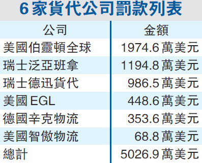 該6家主要貨代公司包括美國的伯靈頓全球、EGL、智傲物流、瑞士的泛亞班拿、德迅貨代和德國的辛克物流,全數被控違反美國反壟斷法《謝爾曼法》,均已認罪及同意接受罰款。罰款金額介乎68.8萬至1974.6萬美元不等。