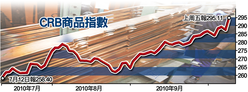 美元兌各主要貨幣持續受壓,加上美國農業部下調產量預估,農產品價格領漲,加上金屬等原材料獲追捧,CRB商品指數單日抽升2.7%至295.11,最高見295.17水平,創2008年10月以來新高。