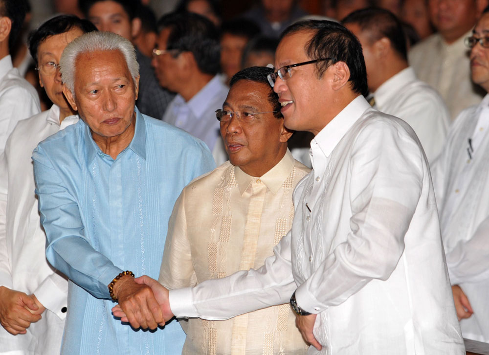 圖:菲律賓總統阿基諾三世(右)在彌撒中與馬尼拉市長林雯洛(左)握手\資料圖片