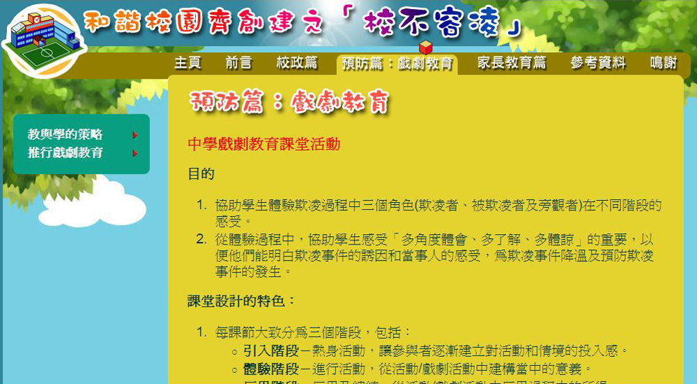 按聯合國《兒童權利公約》第3條3規定「學校有責任向學生提供安全的學習環境,讓學生能愉快學習及健康成長。」教局的資源套除加入預防校園欺凌的家長教育參考資料,筆者較欣賞的是以戲劇培養學生同理心的教案。以前也試行過此項戲劇教學活動,原理是通過欺凌者與被欺凌者的身份切換,調換了角色,投入對方立場(包括欺凌者、被欺凌者及旁觀者),進行角色互動,有助他們設身處地地體驗他人的處境,了解別人的感受、想法及行為動機,從而提升他們的同理心和減少欺凌事件。