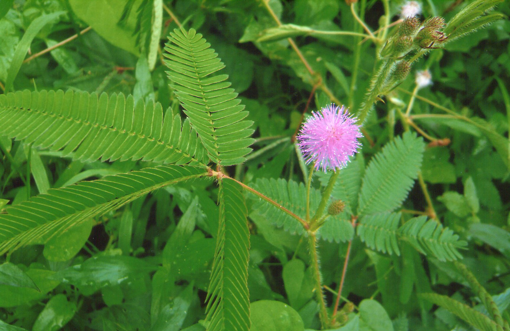 含羞草(Mimosa pudica),豆科含羞草屬植物,常伏地而生。有多分枝,莖部呈圓柱形,上生有倒刺毛和鈎刺,偶數羽狀複葉生於長葉柄上,小葉片被毛,數量多,可多達21對,觸之則閉合下垂,故得名。花色淡紅,細小而數量多,聚生於一總花柄上,遠看像一個絨毛球。藥用全草,味甘、澀,性微寒,能鎮靜安神,化痰止咳,清熱利尿等作用,主治神經衰弱,失眠,支氣管炎,尿路結石等。