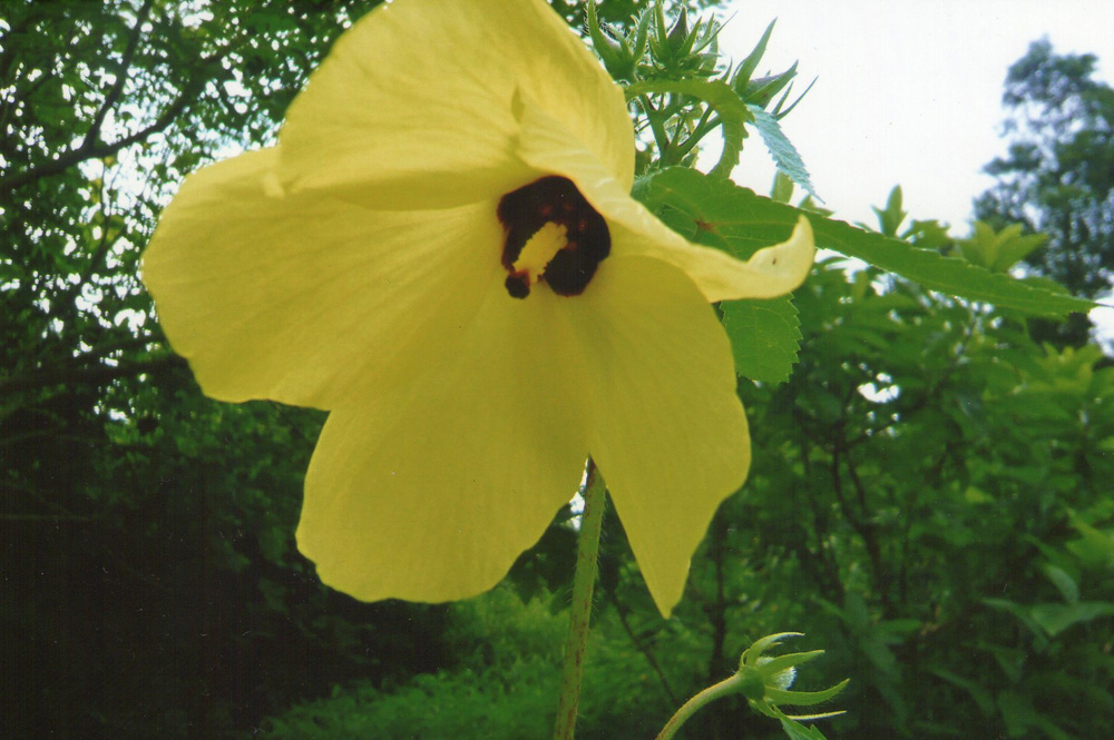 黃葵(Abelmoschus moschatus),錦葵科秋葵屬一至二年生草本,全株被長粗硬毛,葉互生,掌狀深裂,呈3-5個小裂片,橢圓狀披針形,基部心形至戟形,葉柄長,托葉針形。花大色鮮黃,中央暗紫,單生於葉腋。蒴果卵狀長圓形。藥用全草,味微甘,性涼,具清熱利濕,拔毒排膿之功。黃葵的根偏於清熱利濕,常用於高熱不退,肺熱咳嗽,大便秘結,尿路結石等;葉片則常外用於癰瘡腫毒。