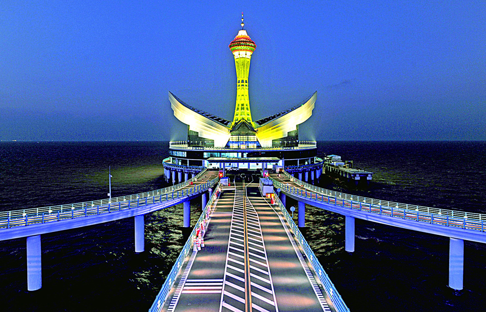 圖:預計年底迎客的杭州灣跨海大橋「海天一洲」夜景(胡建華、馮微紅攝)