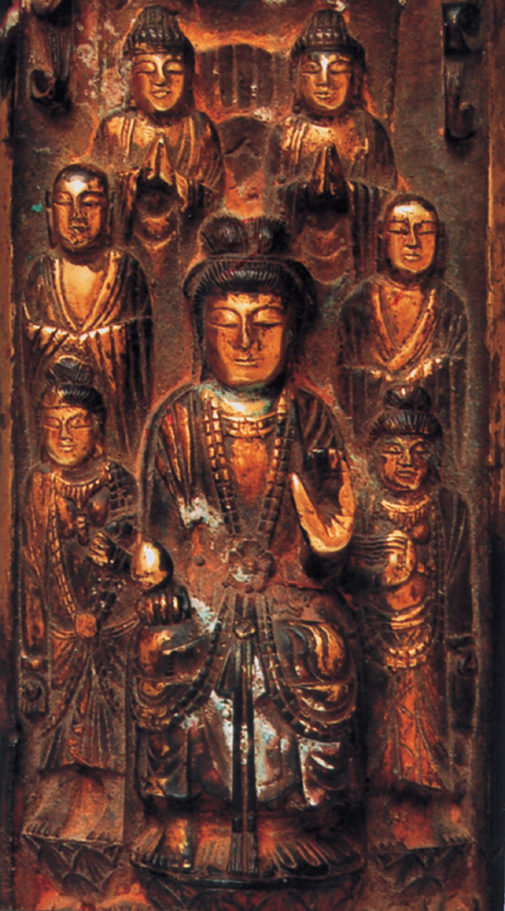 本人藏有的大統四年龕像,下稱「大統龕像」,高230毫米,青銅整體鑄成,通體鎏金,主佛像是菩薩至尊「南北佛」,佛像髮髻式樣、持蓮花姿態,「右手持蓮稱菩薩」的提示我,將主佛身份定菩薩,她髮髻高聳,上髻扇形狀,長髮順耳下垂至肩,面相豐腴圓潤,頸粗短、鼻高眉細彎長,眼大微開下視,五官娟秀,表情莊重沉靜,流露出大慈大悲溫和清麗的高雅神韻,身着半袒式袈裟,又似再披一件略覆右肩的偏衫,胸前飾環形項圈,由粗大珠粒聯串長瓔珞呈X形,交叉處飾一朵五瓣花,花下二結帒下垂至座沿,左手上揚施無畏印,右掌輕握掌心向下置右腿,掌背置物似仙桃,應是含蕊將開放的佛門聖花,蓮花似有柄被握,握蓮姿勢與日本高野山金剛峰藏龕像「南北佛」的標形佛圖完全相同,北朝佛多見此造型。菩薩下穿非出水式長裙,裙紋多褶飄逸,左腳搭在右膝,右腳下垂赤足踩蓮座,半跏式坐姿端莊坐在仰覆式蓮形寶座上,圍繞主佛,高浮雕彌勒、弟子、菩薩六身協侍。諸佛菩薩的服飾紋路深刻清晰秀美,飾物精巧華麗,造型與北齊的薄衣貼體截然不同,雖具北魏遺緒,但總趨勢突出北朝濃郁特色。西魏都城長安,地處西北,受周邊遊牧民族影響,迎合當時人們的審美情趣,多數佛像臉形自此日趨豐滿,呈頭大身短,驅體略顯笨重,比例欠協調,肌體敦厚結實,展現西北少數民族身強力壯的健美體魄、粗壯肥碩新風貌,在「大統龕像」七佛型充分表現(北魏晚期有的佛像也有此特徵)。