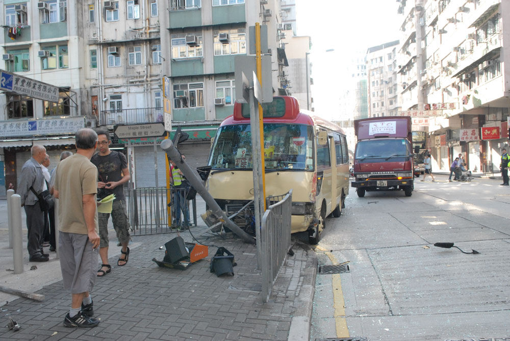 交通意外現場在汝州街與楓樹街交界,昨晨七時四十分,一輛紅頂小巴滿載乘客,沿汝州街快線往葵涌方向行駛,至楓樹街交界時,由於快線僅能右轉,有人扭軚切入中線,期間一輛貨車馳至,兩車發生碰撞,小巴繼而失控衝前,撼撞路中鐵欄及交通燈柱後始停下。小巴上兩男女乘客受輕傷,由救護車送院治理。警方正調查交通意外原因。