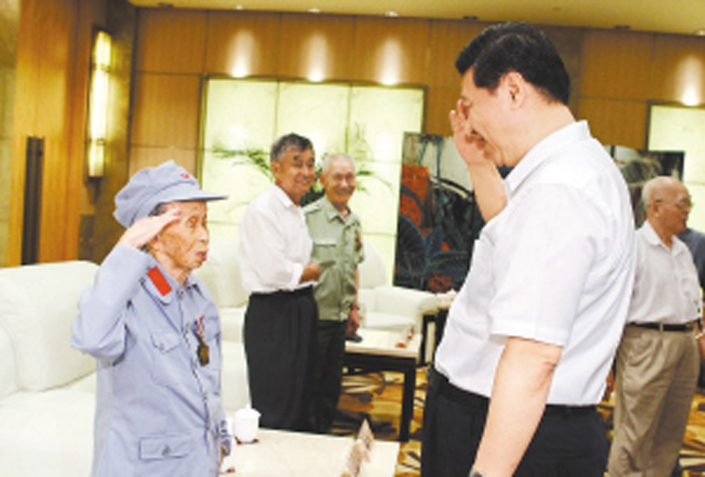 圖:習近平(右)四月參加海南解放60周年老戰士、老同志代表座談時,與原紅色娘子軍連戰士、百歲老人王運梅互致軍禮網絡圖片