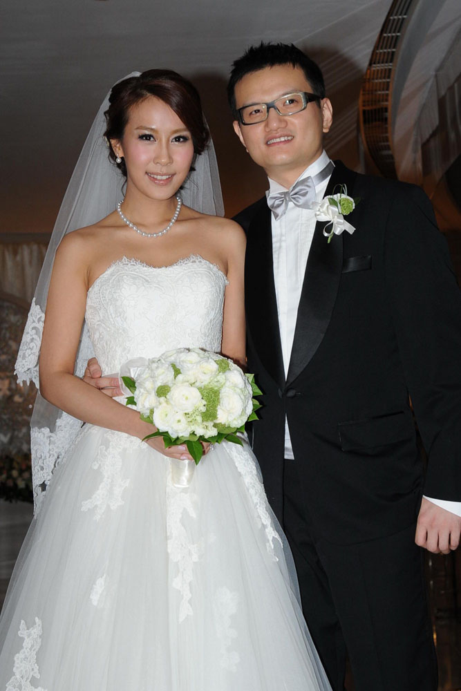 港姐曹敏莉(Mandy)早前於美國與半億身家的金融才俊張家傑(Jacky)註冊結婚,昨晚於四季酒店擺喜宴,筵開十九席。一對新人傍晚六時會見傳媒,更應記者要求六度親嘴,相當甜蜜。